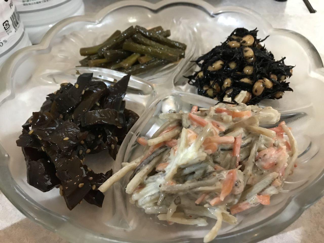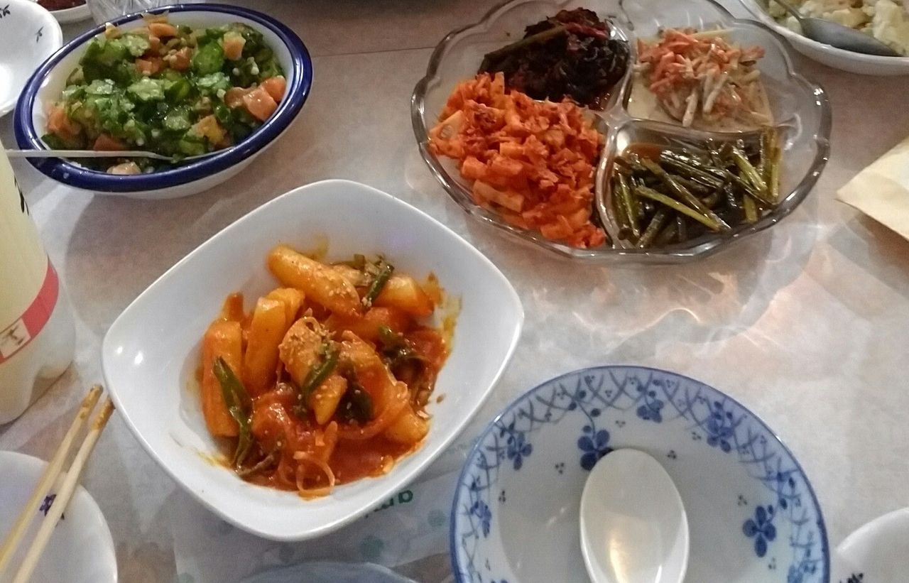 前菜のトッポッキ、チョレギサラダ、青海苔和え、トラジ、にんにくの芽辛し和え、ゴボウキムチ、