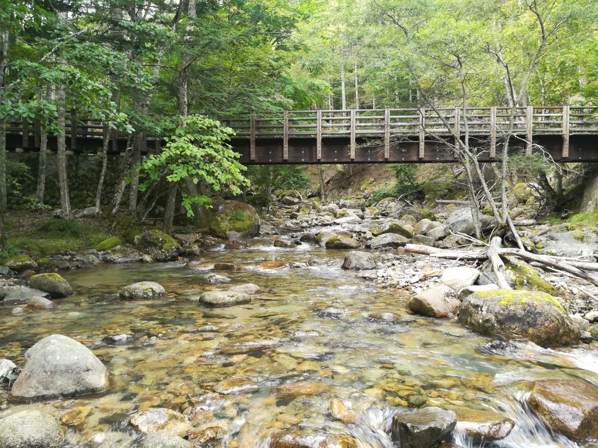 登山道に続く趣のある橋をくぐって上流へ