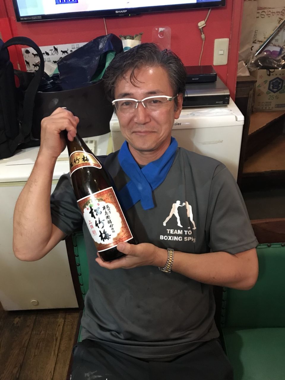 この日ボクシングの試合で、お約束の技を見事に使いこなしチーム徳のMVPとなったmasahikoさん(右手前から2番目)には、部員一人300円集めて新年会参加費無料と言うお祝いがなされました。
