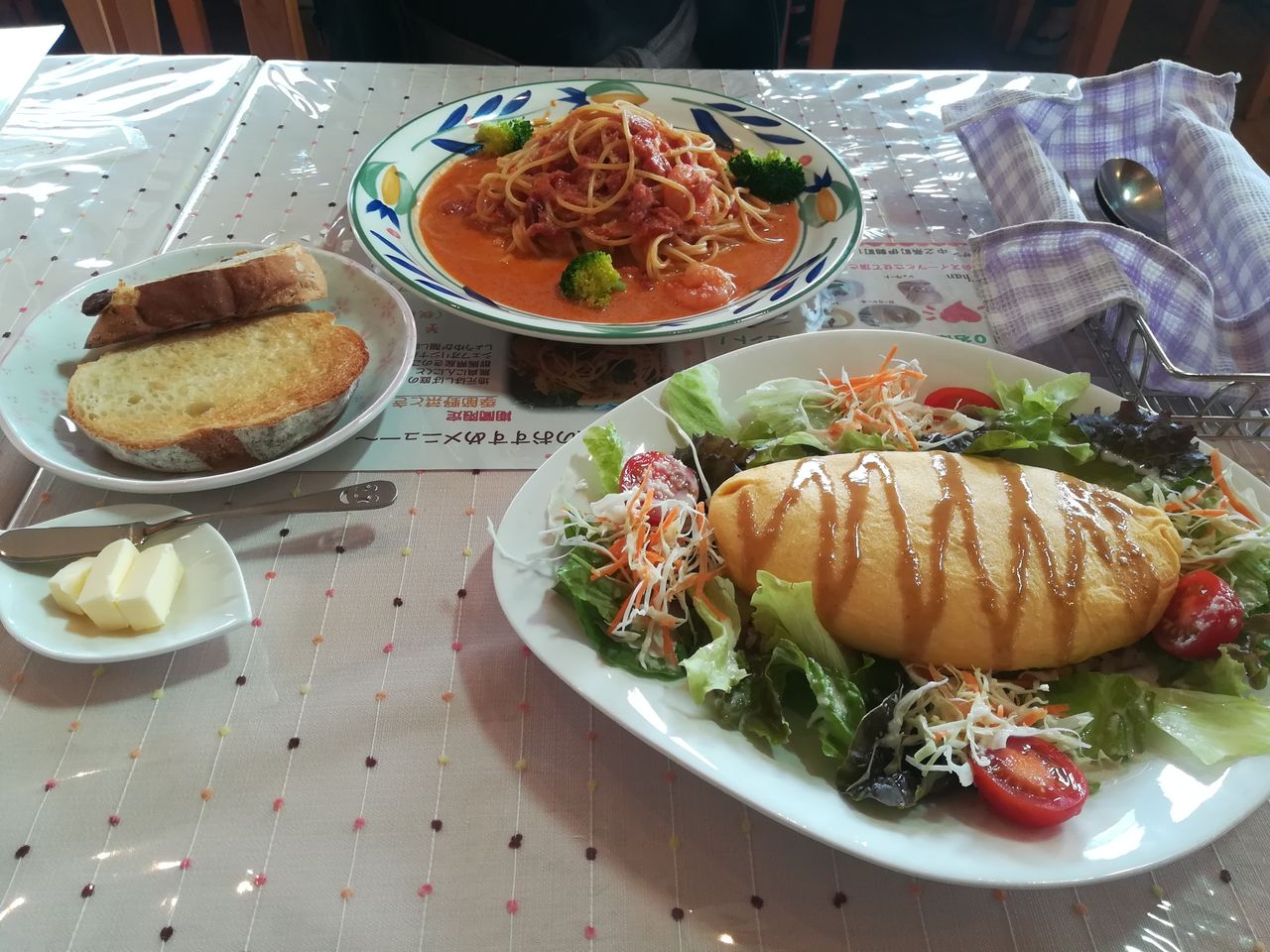 モアザンのオムライスとアイスコーヒーとパン。後シュークリームとサービスのゆで卵とプリンを食べた。